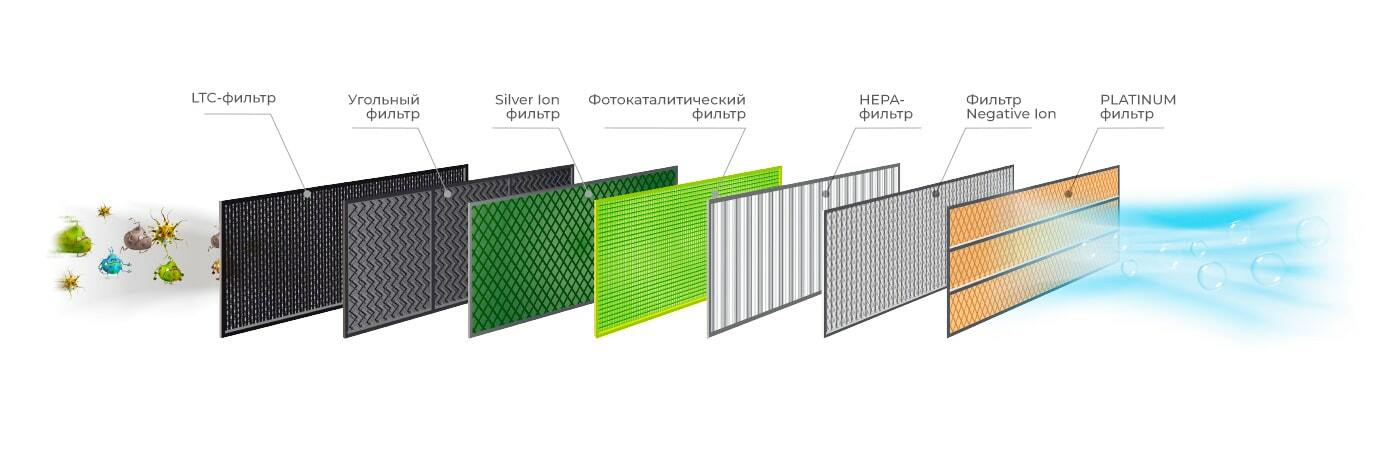 Фильтры: LTA, угольный, Silver Ion, фотокаталитический, HEPA, Negative Ion и Platinum.